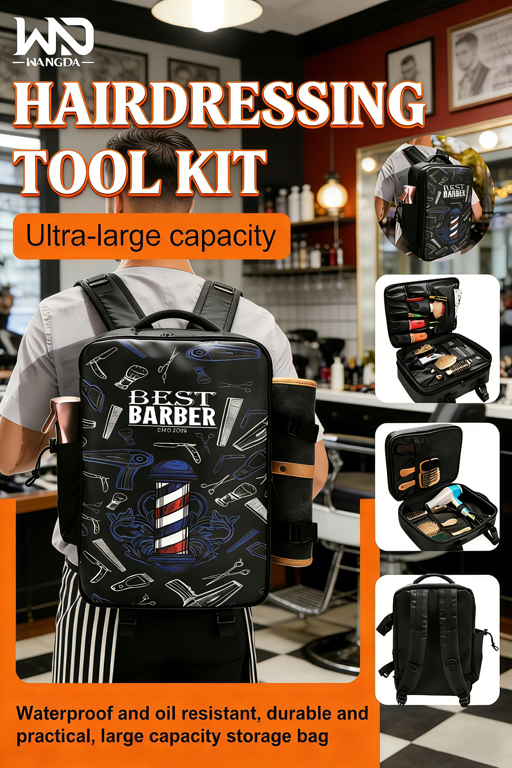 More than just a storage bag, this backpack is a badge of professional pride. The bold black design features classic barber pole art and tool illustrations, paired with the iconic “BEST BARBER” branding—making it instantly recognizable to clients and peers alike. It’s a bag that doesn’t just carry your tools; it tells the world you’re a skilled, dedicated professional.